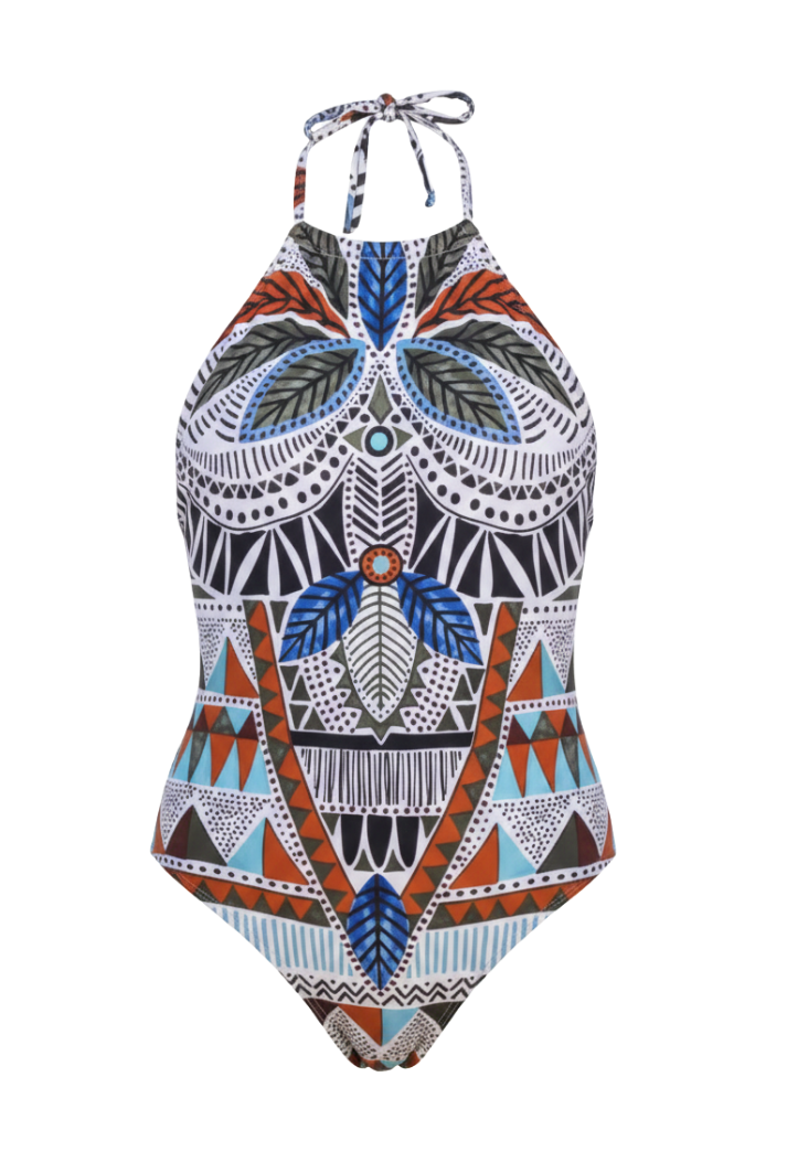 Elevate your beachwear collection with the Palma swimsuit, a vibrant fusion of African-inspired heritage and contemporary swimwear design. The Palma one-piece swimsuit is a standout piece from OBÔ Tropic Life’s signature collection. Featuring an intricate, symmetrical tribal motif in earthy tones of burnt orange, deep teal, and forest green, this swimsuit is designed for the woman who seeks both elegance and a connection to nature. With its flattering high-neck silhouette and sustainable craftsmanship, it is the ultimate "eco-luxury" essential for your next tropical escape.
