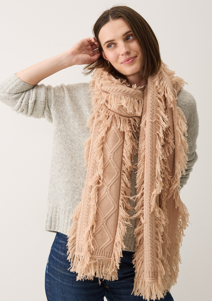Toffee brown cashmere fringe scarf with textured knit and long fringed edges.