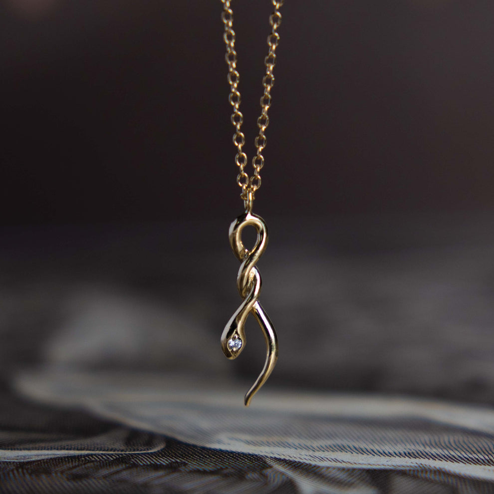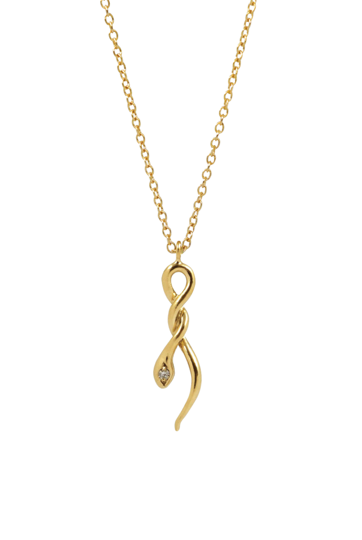 Regular price $660.00A refined symbol of transformation and renewal, this 14k yellow gold snake necklace captures timeless elegance with a modern edge. The slender, twisted form of the snake is handcrafted to resemble a flowing ribbon, ending in a 1.2mm white diamond that adds a subtle touch of brilliance.