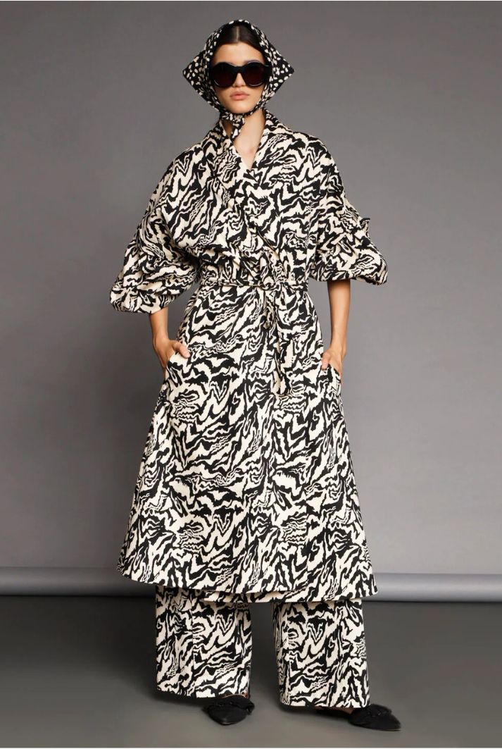 Perfectly tailored for modern versatility, this trench coat can be worn as a classic longline style or with a sleeveless edge for a fresh twist. Pair it with the matching dress or pants in the same print for a coordinated ensemble that exudes confidence and sophistication.
