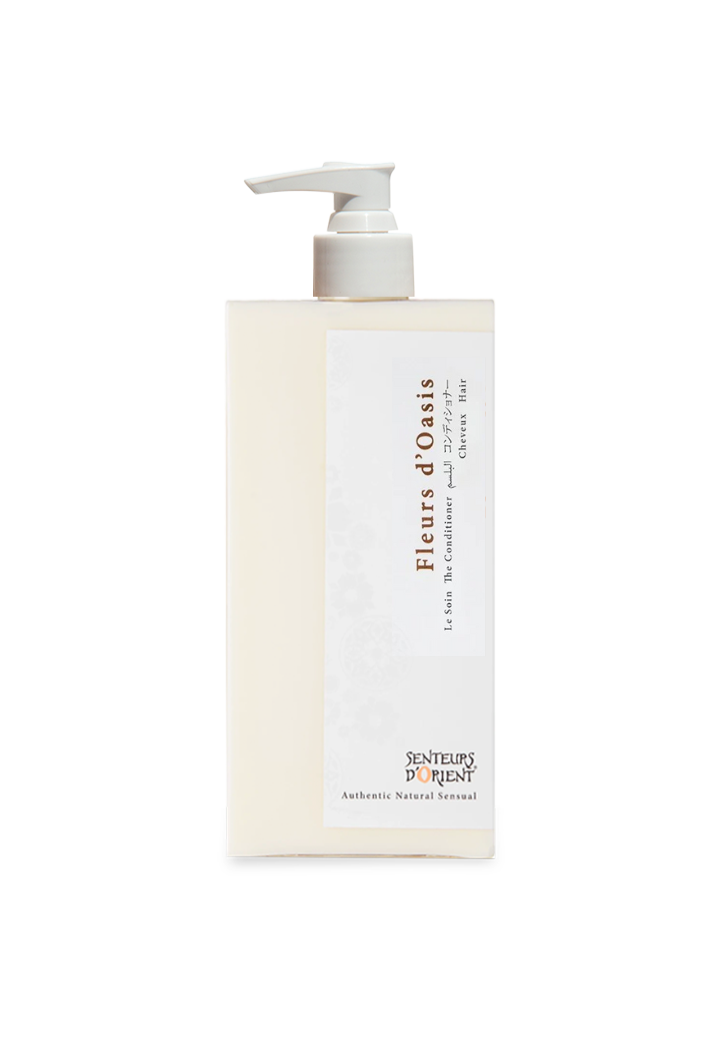 Fleurs d'Oasis The Conditioner, a weightless treatment balm, leaves the hair radiantly nourished and delicately scented.