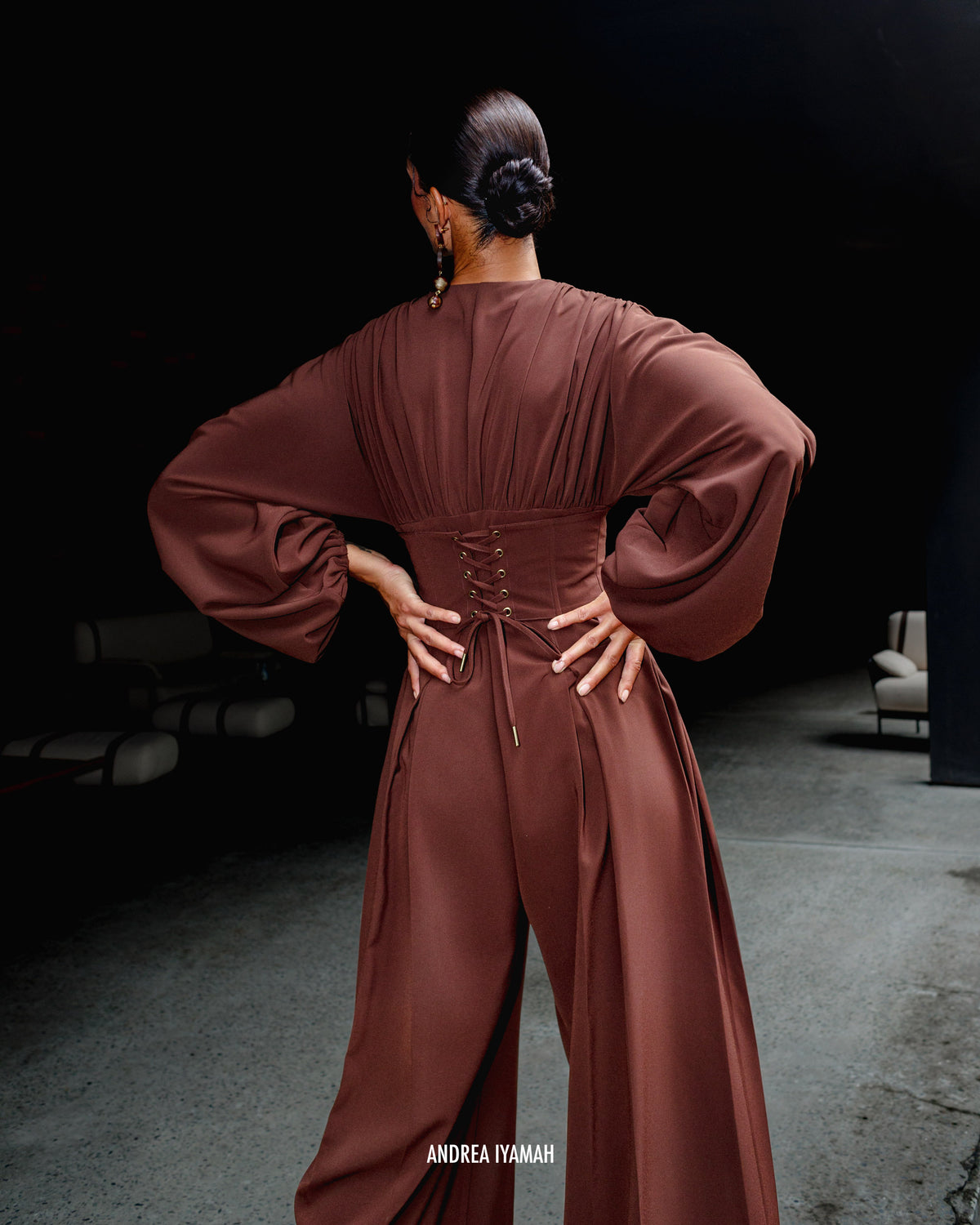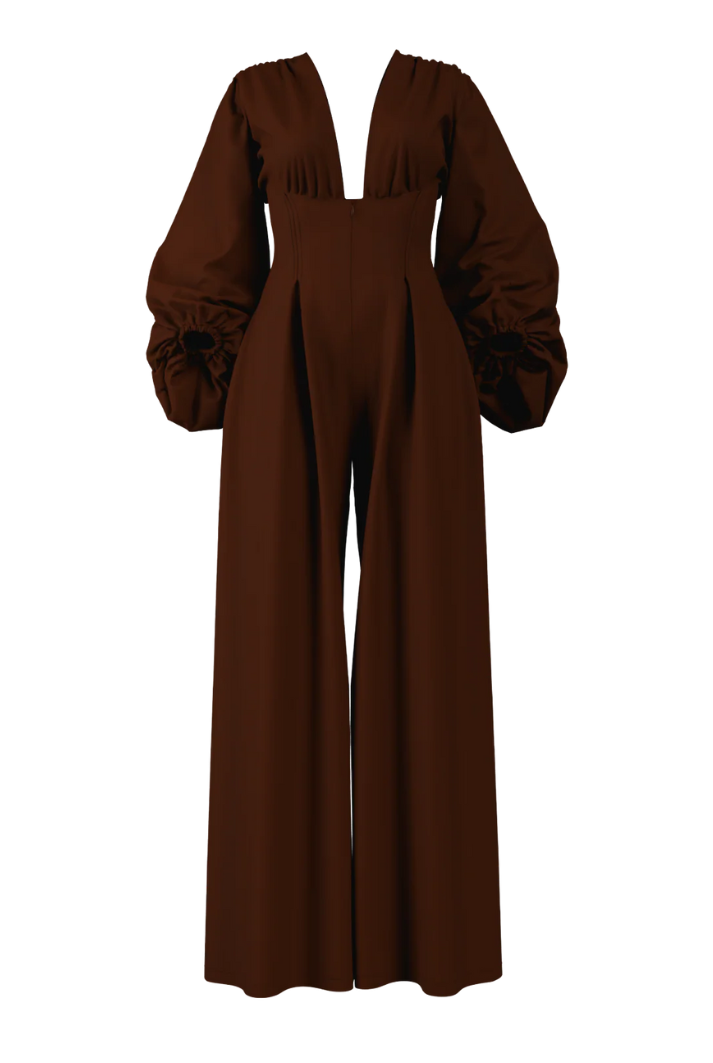 Andrea Iyamah Zerra Jumpsuit designer wide leg jumpsuit with deep V neckline bubble sleeves lace up corset back and tailored fit