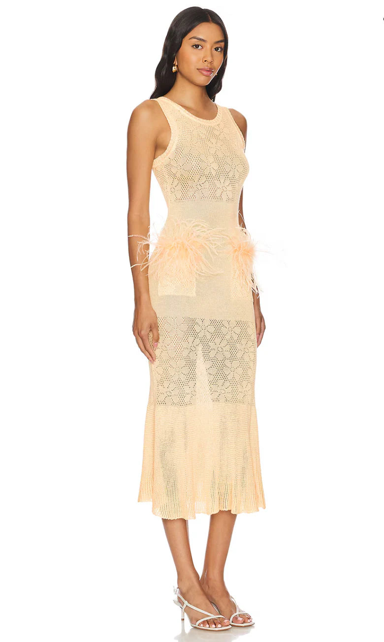 Add a touch of modern elegance with the Butter Yellow Knit Midi Dress with Feathers, a statement piece that blends playful detail with refined craftsmanship.