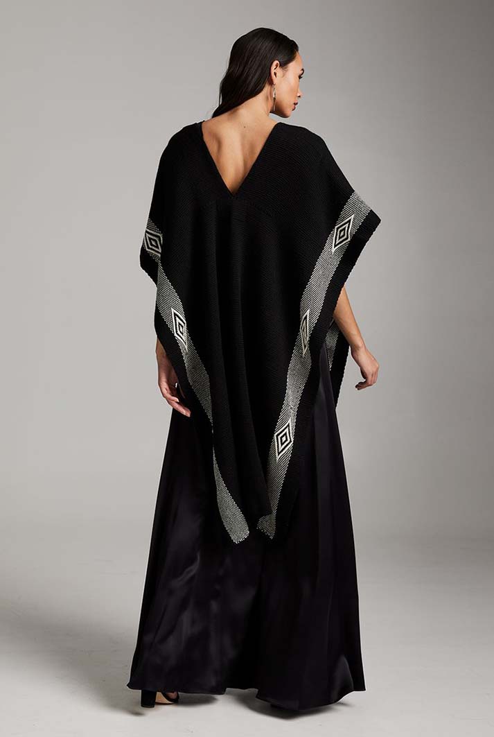 Mid-length manta, or poncho, is hand-loomed in merino and features the diamante symbol, which represents the spirit's eye for protection.