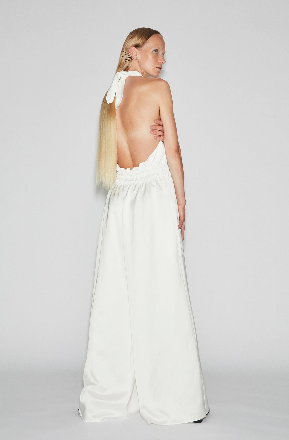 Halter neck jumpsuit with low back, ruching in waist and wide leg. Adjustable to fit different bust sizes. Fits true to size. Made in Italy.