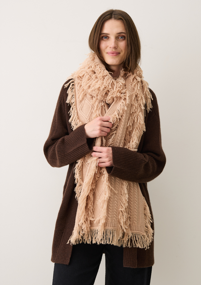 Soft cashmere winter scarf in warm toffee brown with cable-knit pattern and tassel fringe trim.