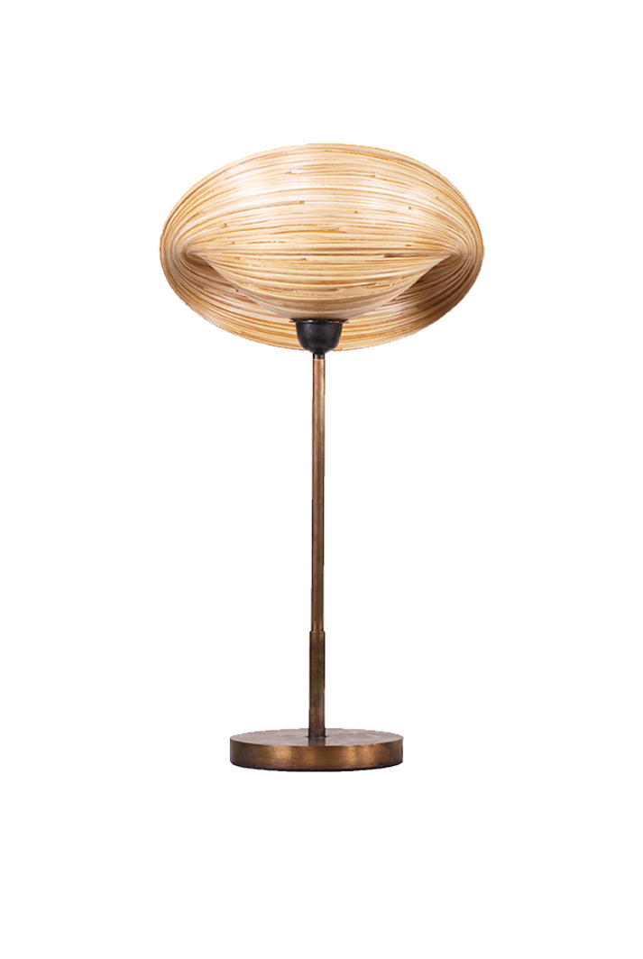 Regular price $435.00Part of the Bambusa Collection, the Kirana Bamboo Shell Table Lamp is a striking blend of natural materials and artisanal craftsmanship. Designed to sit beautifully on a work desk, nightstand or side table, this lamp is named after the Indonesian word Kirana, meaning “ray of light” or “all that is beautiful.” Each lampshade is handcrafted from thinly sliced layers of bamboo, shaped into the collection’s distinctive Shell silhouette, and set on a bronze pedestal with V-Legal certified wood. Because bamboo is a natural material, each lamp features subtle variations in color, making every piece unique. Providing a warm, ambient glow, the Kirana Lamp is both functional and decorative, embodying sustainable design and timeless elegance. Perfect for those seeking handmade bamboo lighting that brings organic sophistication into their interiors.